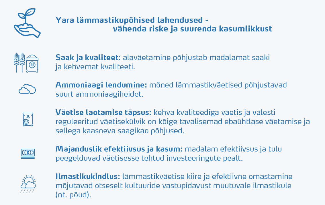 Tuginedes meie teadmistele ja kogemustele ning tehes koostööd põllumajandustootjate ning teiste sektori inimestega, oleme seadnud tähtsuse järjekorda viis riski. Just nende riskide minimeerimiseks ja põllumajandustootmise jätkusuutlikkuse suurendamiseks olemegi välja töötanud lämmastikupõhised väetamislahendused.