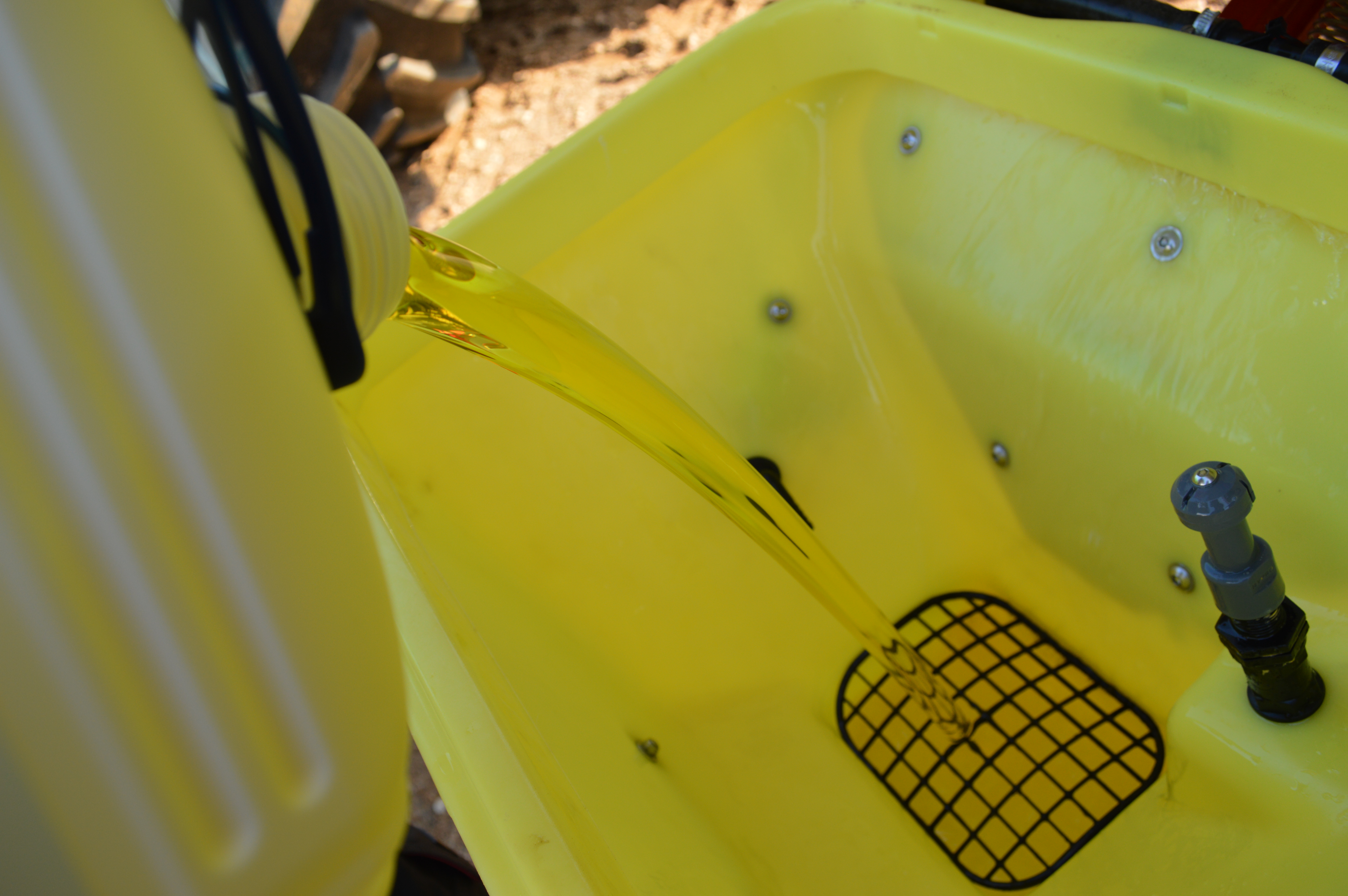 Esimene, mis paaki läheb, on pool pritsitäit vett. Edasi tuleks lugeda etikette. Kui segusse on plaan panna pulbreid või graanuleid, siis need lähevad alati esimestena. Sellegipoolet tuleks siin jälgida ka tähiseid: esimesena tähisega WS (water soluble) - näiteks YaraTera tooted, edasi WP (wettable powders) - veeslahustuvad pulbrid ning lõpuks WDG (water dispersible granules) ja DF märgistusega tooted. Kui kõik vajalikud graanulid/pulbrid on paaki lisatud, tuleks korraks sirutada jalga, umbes 3-5minutit, et kõik tooted jõuaksid lahustatud.