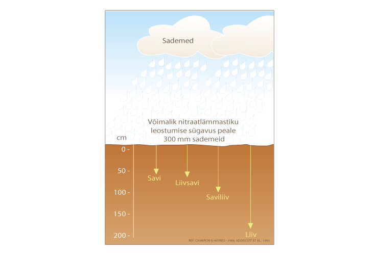Oht on olemas, kuid kui vaadata meie (loe: Eesti) klimaatilisi tingimusi, siis pigem võitleme rohkem kasvuaegse põuaga, kus niiskuse puudumisel ei jõua lämmastikväetis mulda, juurestiku piirkonda. Oht nitraatlämmastiku leostumiseks on suurem kergematel liivmuldadel, kuid ka selleks on vaja üsna suurel määral sademeid lühiajaliselt, sest taimed hakkavad ka koheselt mulda antud lämmastikku tarbima. Raskematel savimuldadel on leostumise võimalus veel madalam (Joonis 1).